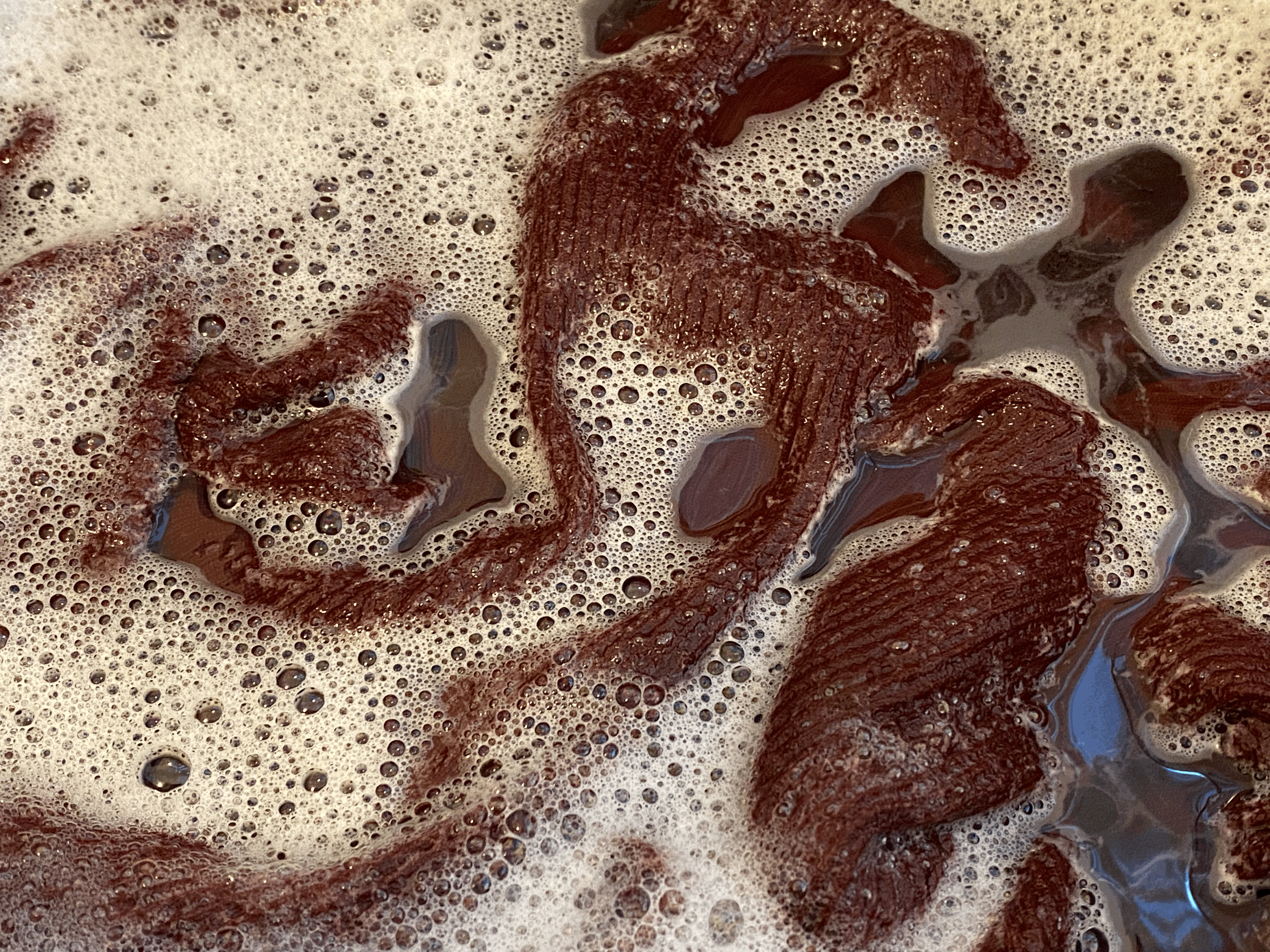 If you're using a wool wash that requires rinsing, fill the sink with the same temperature water as you just used for the wash. You want to avoid any temperature shock that could make the fibers retreat in fear. Then lower your bundle back into the water, tap, swish, and gently squeeze until you've gotten out any remaining soap. If the water is still bubbly, you may need to repeat this twice, but it's really no big deal.